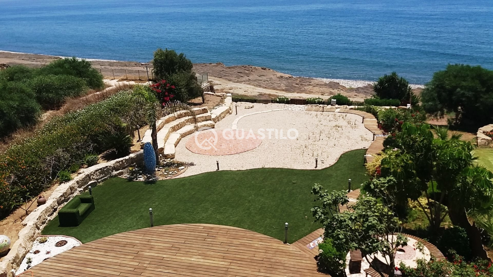 A beautiful seaside villa, located at Zygi just 20 meters from the coast. The villa consists of 4 bedrooms-5 bathrooms, some with steam bath- open plan salon with kitchen and unobstructed sea view – TV room- Moroccan style indoor heated pool area with Jacuzzi, sauna, salon and glass roof- roof garden with a view of all surrounding area and beach – basement with home cinema, playroom, bedroom and 2 cover parking places – The villa has large verandahs with sea view and beautifully landscaped garden with stones, mosaics, sculptures. Additionally, the villa has a glass door elevator for all floors, cellar, 3 storage rooms, 4 cover parking places, smart house system, Internet, CCTV cameras, alarm system, lighting system, Intercom telephone system, central music system, solar storage system, floor heating units, air-conditioning system, fireplace, wall and floor mosaics in bedrooms and sitting areas. Enjoy the privilege of this beachfront villa with complete privacy direct to the ocean.