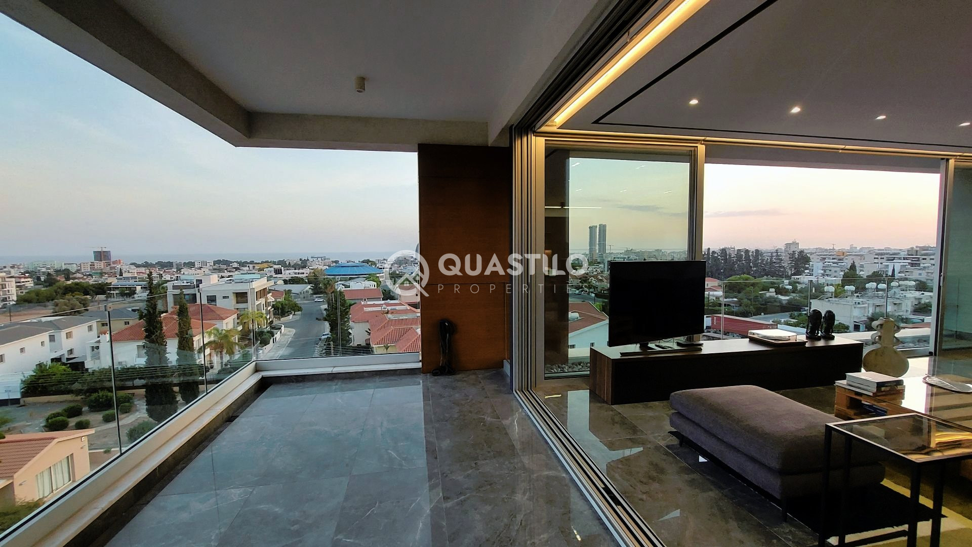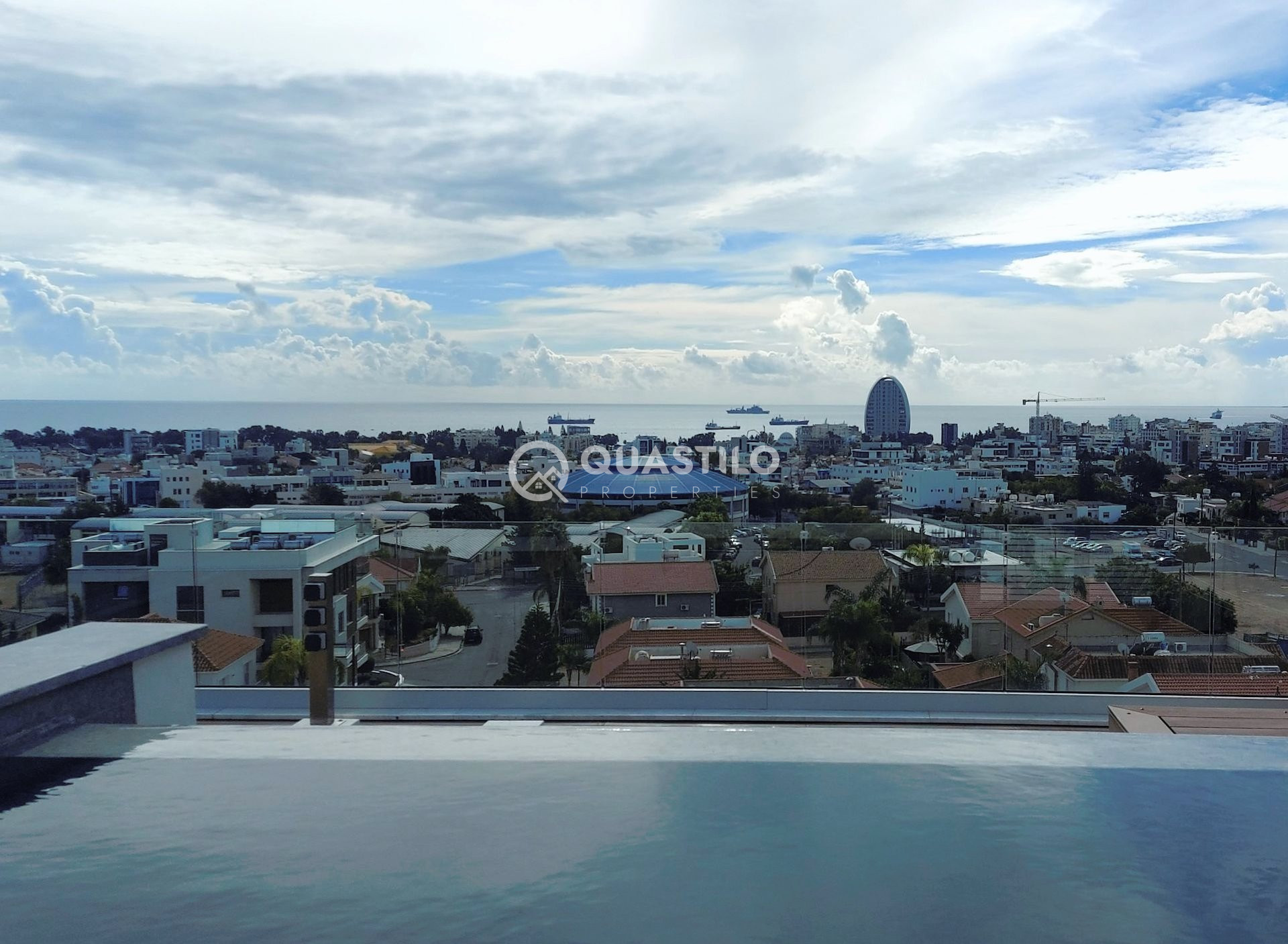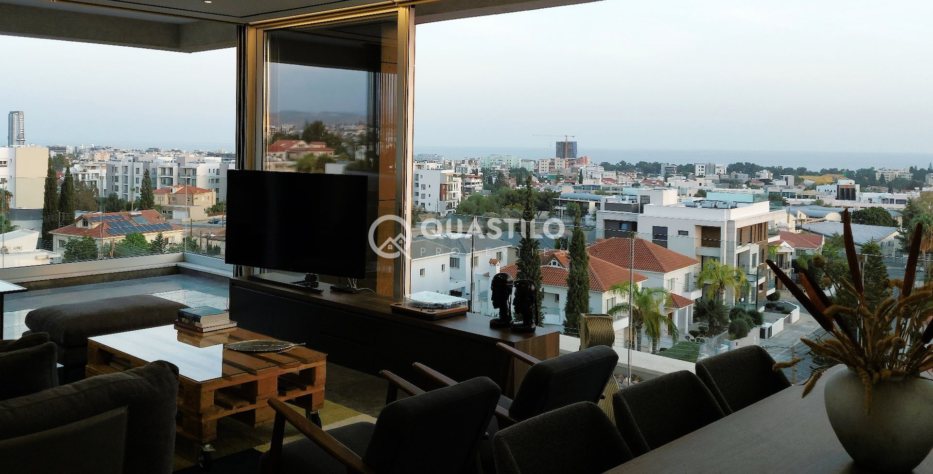 Contemporary design, splendid location close to the beach, in Linopetra, Limassol, within walking distance to amenities and easy access to all main roads. This modern penthouse with title deeds has covered area: 119m², covered verandas: 44m², uncovered veranda: 6m², private roof garden: 71m² and private pool. It consists of 3 bedrooms, master bedroom with en-suite shower, family bathroom, open plan kitchen, living and dining area, guest toilet, verandas and private roof garden with overflow swimming pool with bench and jacuzzi jets, kitchenet, shower, and toilet. The property is fully furnished, include 5 top-brand A/C units with central VRV system, underfloor central heating with heat pump, photovoltaic panels, electric blinds, electric shutters in the master bedroom, black-out curtains in all bedrooms, Italian-manufactured kitchen, electrical appliances, deck floor on the rooftop, high-quality porcelain tiles, high-quality laminated parquet floors in the bedrooms, adequate power points, TV, internet, and telephone points (one in each room and two in the living room), hidden lighting in the living room, entrance phone with full-color video, storage room on the ground floor, electric gated entrance, 1 covered private parking space with possible second car park, security cameras in the parking area and at the entrance of the building and much more. Don’t miss the opportunity to own this stunning property with unique unobstructed Limassol sea and skyline view.