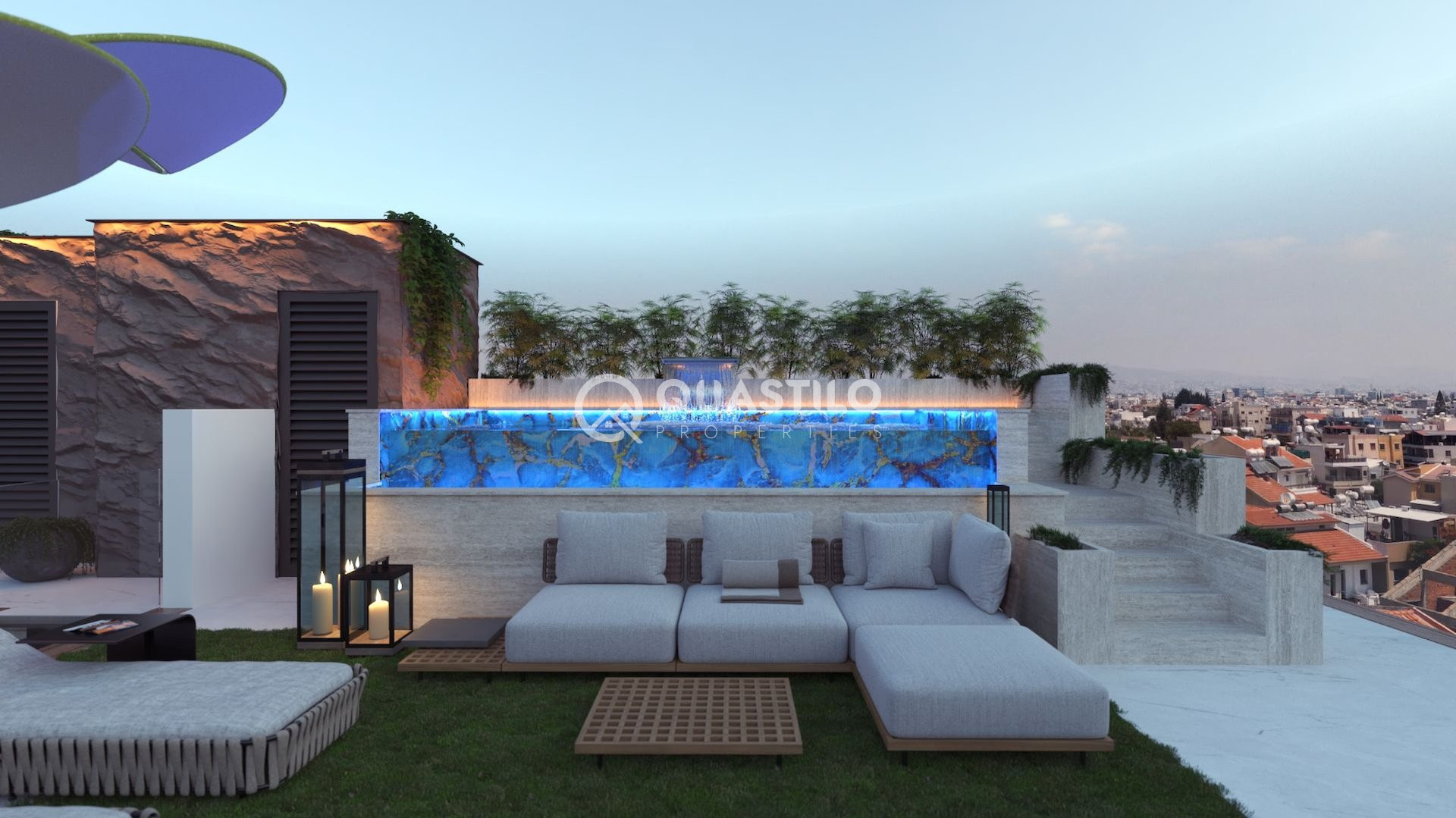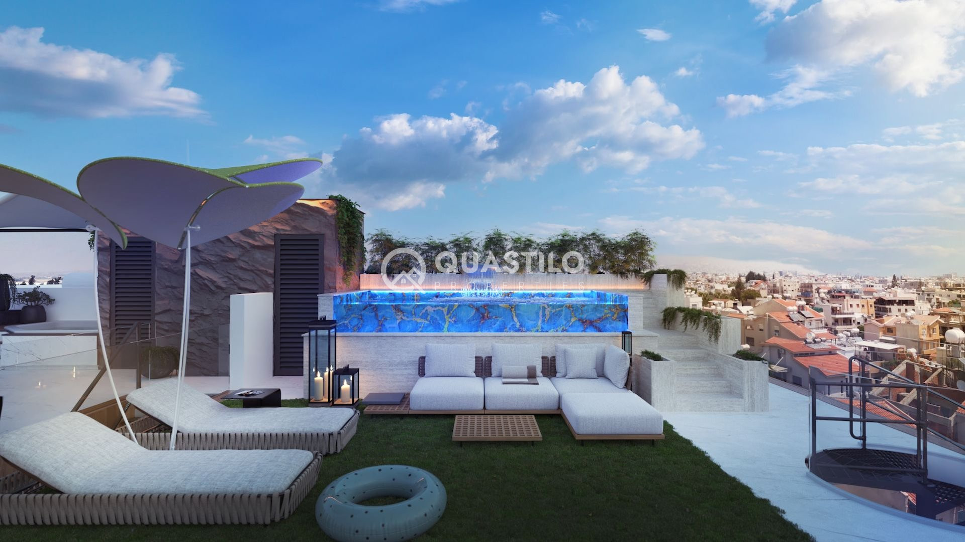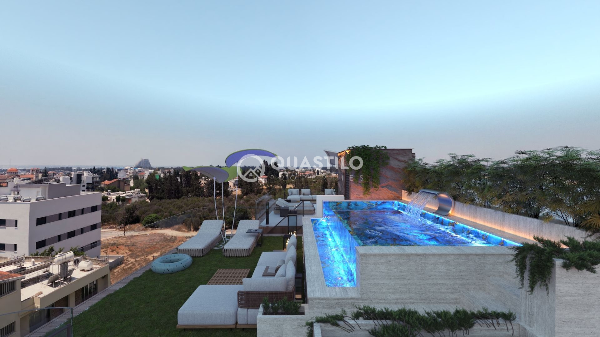 Infinity pools with mosaic tiles, roof gardens featuring ceramic tiles, BBQ areas, dedicated space for pergolas and utility connections.