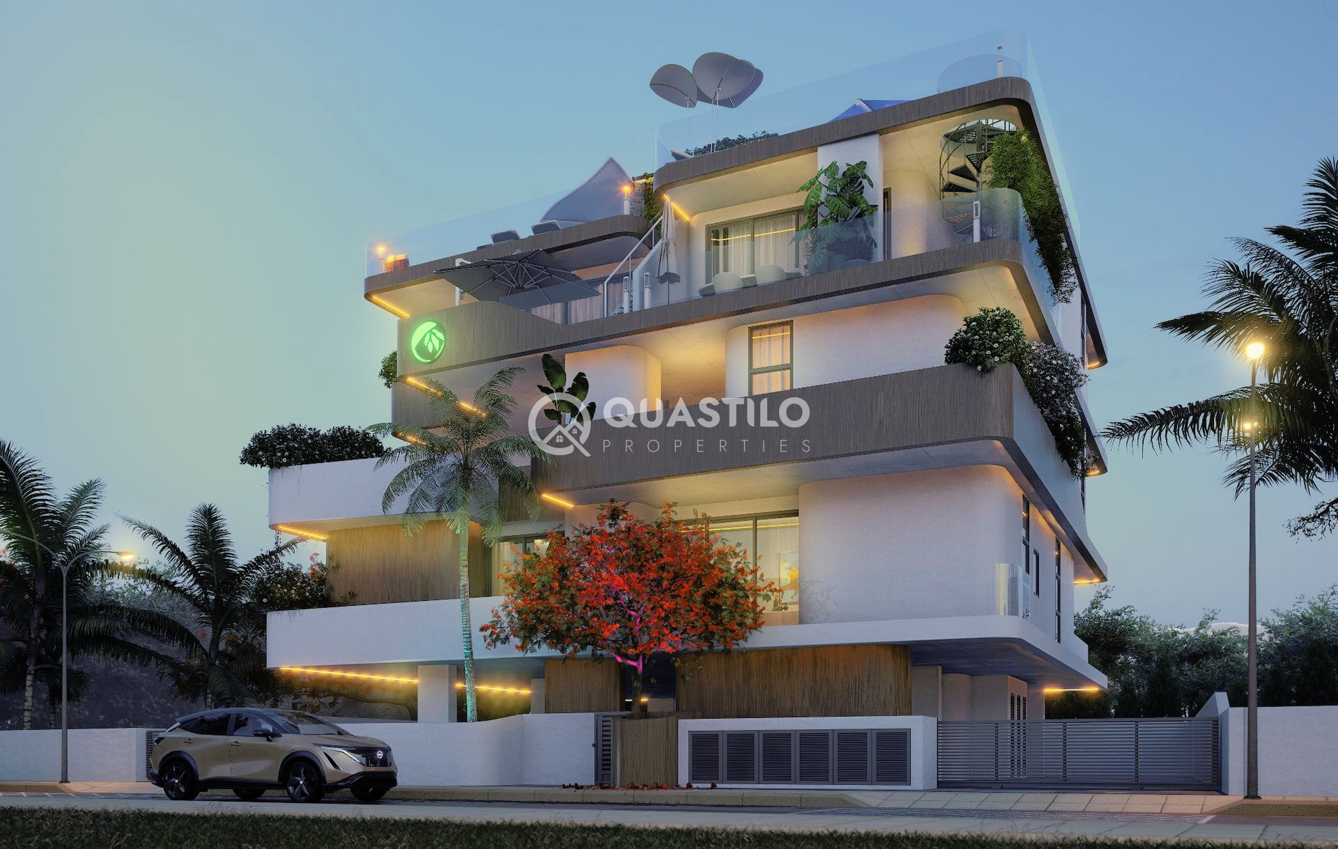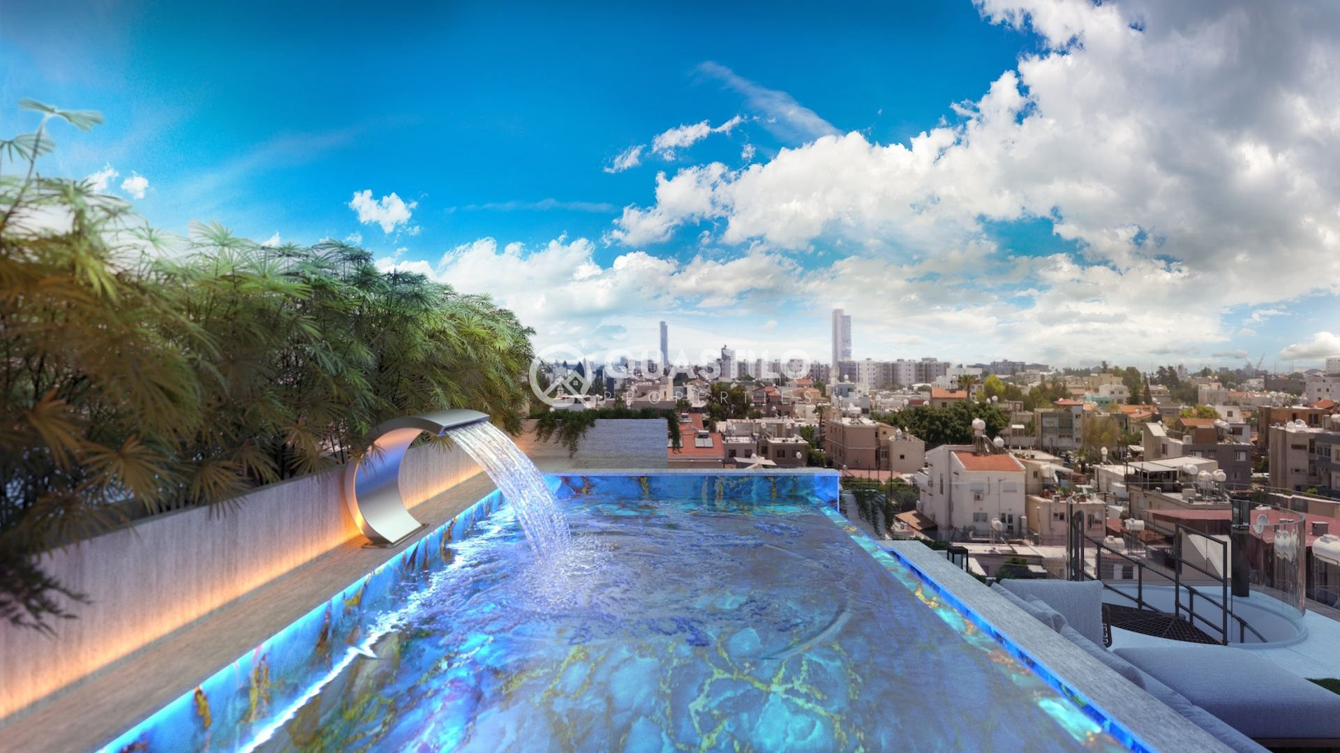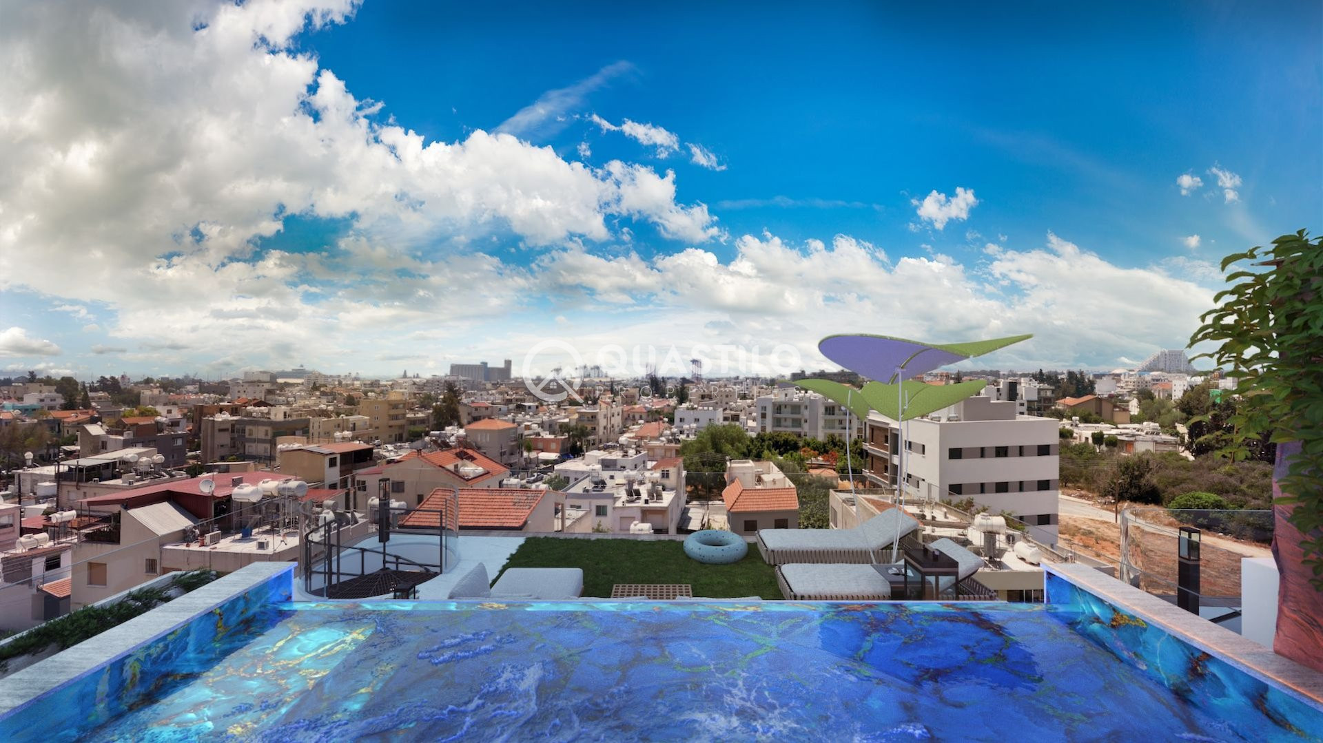 Infinity pools with mosaic tiles, roof gardens featuring ceramic tiles, BBQ areas, dedicated space for pergolas and utility connections.