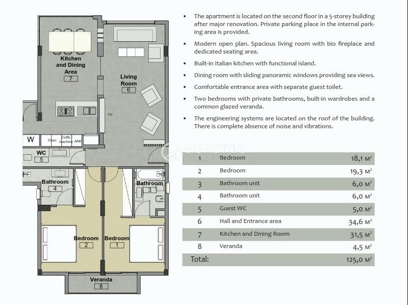 Don’t miss the opportunity to own this luxury, fully furnished apartment, located on the beach in a relict grove, in one of the most popular and comfortable areas of Limassol, near Dassoudi Park. The apartment, with a total area of 125m² is convenient for permanent residence and for an unforgettable holiday at any time of the year. The design of the apartments is concise, simple, and ideal, where the interior itself becomes functional. The open plan combines a bright and cozy living room with a spacious dining room and kitchen. The dining area with panoramic windows is easily transformed into an open terrace surrounded by eucalyptus trees. The stylish modern interior of the apartment is decorated in light colors with natural materials. The main role in the design of the apartment is played by verified rectilinear forms. Built-in glossy cabinets and kitchen exterior panels are an extension of the walls, smoothing the boundaries, creating a sense of open space. The clear contours of the upholstered furniture complement the elegant and modern design of the apartment. The use of solid wood creates an atmosphere of warmth and comfort. The rooms are as functional as possible, there is a sense of order in everything. Modern trends in the design of bedrooms tend towards freshness and space. The bio-fireplace in the center of the apartment is a good solution for long cozy evenings in the living room. The apartment is situated on the second floor in a 5-storey building after major renovation. Private parking place in the internal parking area is provided.