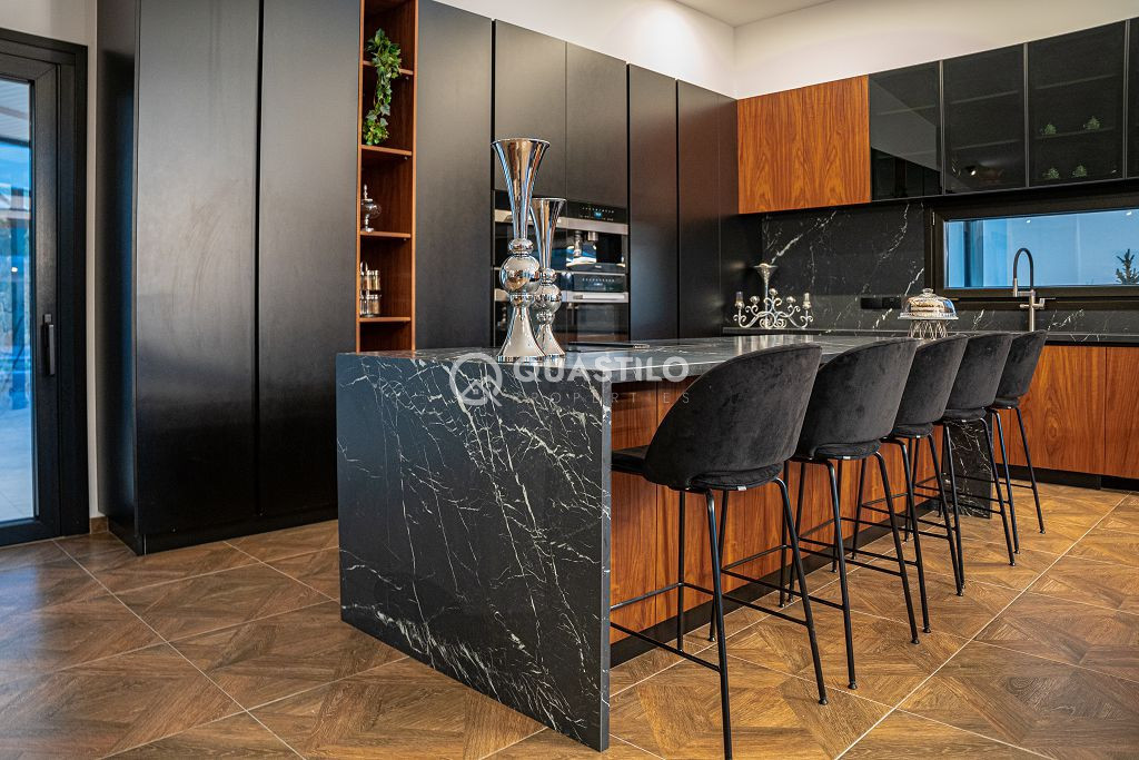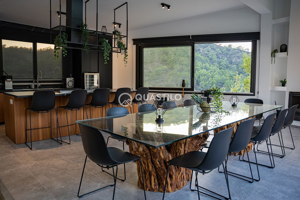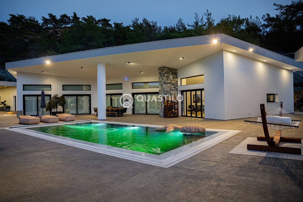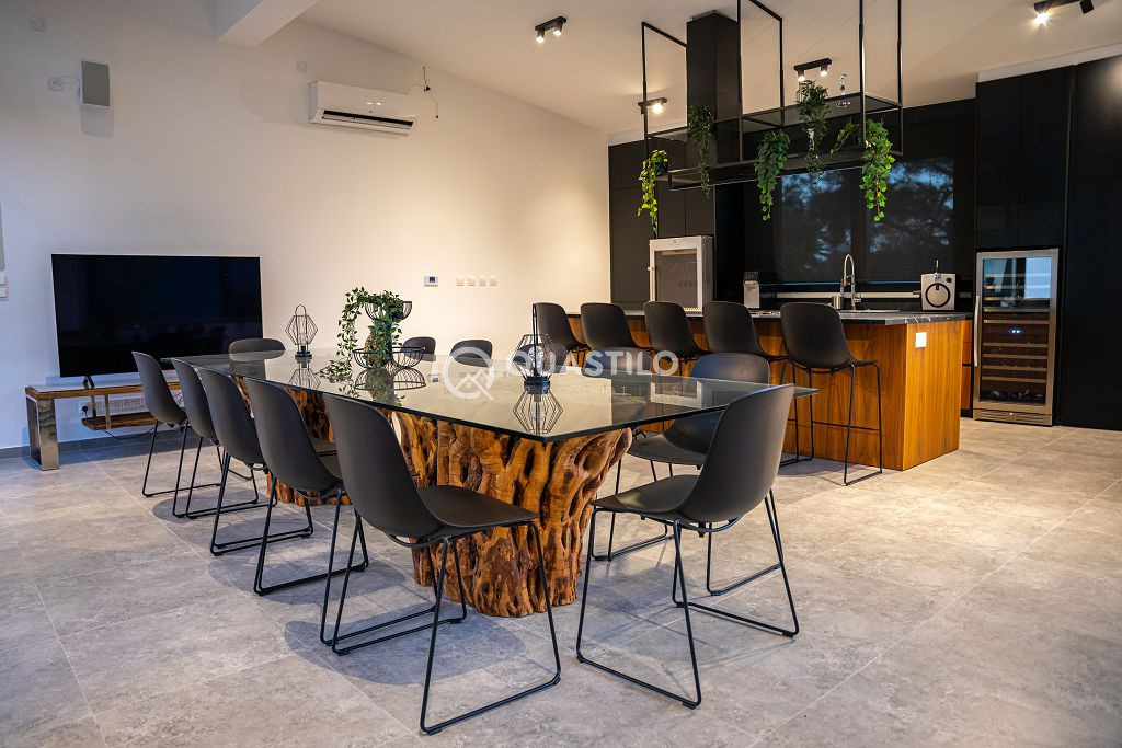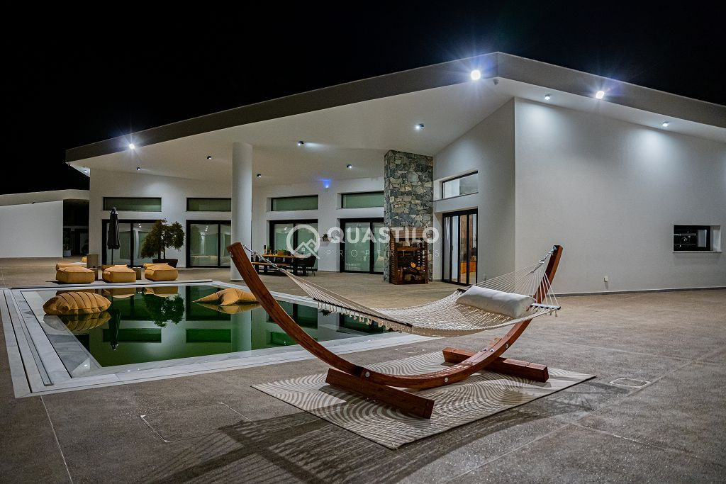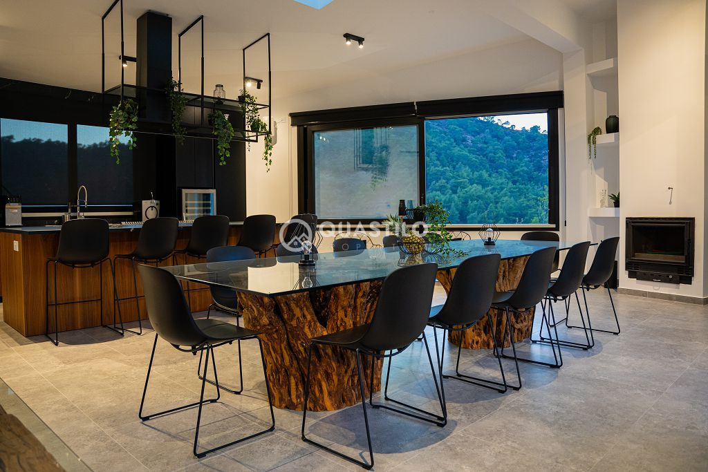 Blending modern architecture with natural materials – stone, wood, and glass – the villa harmonizes beautifully with its surroundings. Spacious 250m² single-level villa with high ceilings, featuring 4 Bedrooms all en suite, guest toilet and a large ergonomic kitchen with built in mechanisms. On the same 13,156 sqm Plot, 2 fully independent guest rooms with private bathrooms.